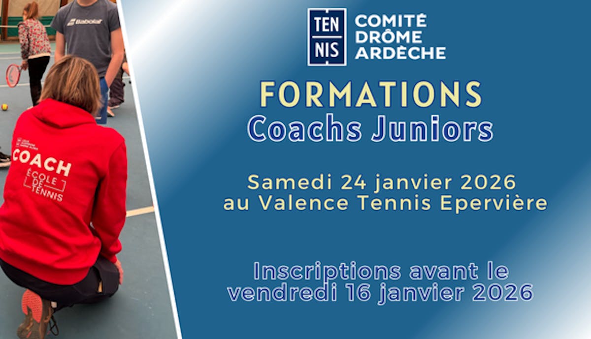 AccueilActualitésFormations Coachs JuniorsFormations Coachs JuniorsArticleEnseignementAgrandir l'imageSamedi 24 janvier 2026 au Valence Tennis EpervièreInscriptions avant le vendredi 16 janvier 2026Retrouvez les détails et les modalités d'inscription iciSur le même sujetFormations EnseignantsArticleEnseignementFormations EnseignantsVoir tous les articles