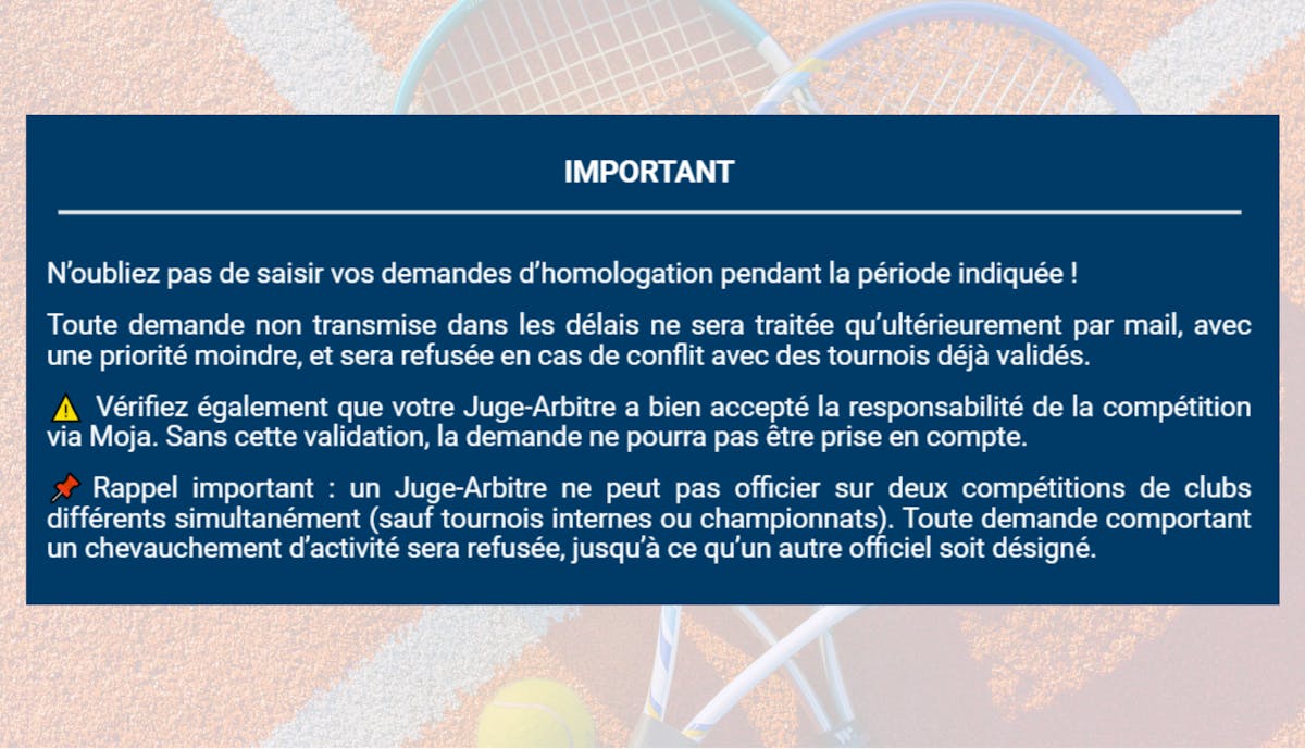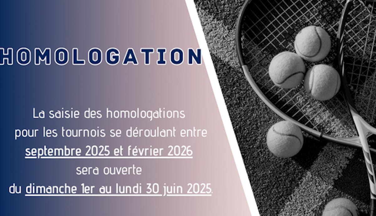 La saisie des homologations pour les tournois se déroulant entre septembre 2025 et février 2026 sera ouverte du dimanche 1er au lundi 30 juin 2025.