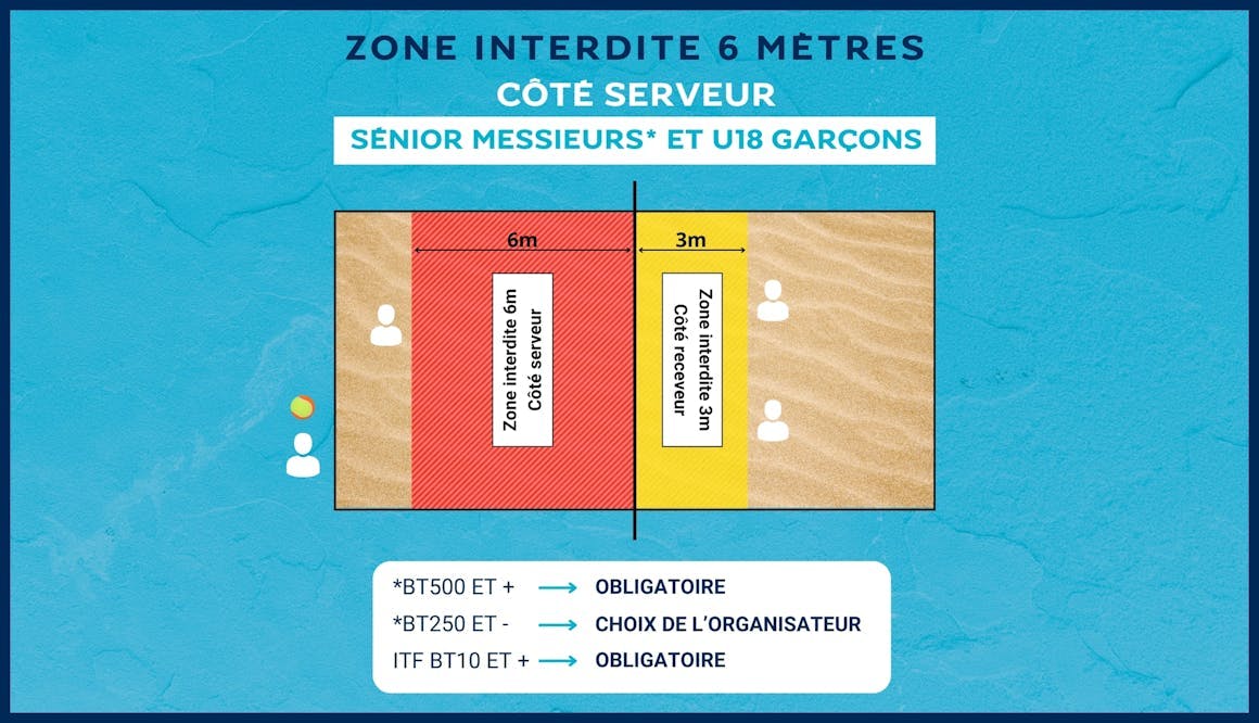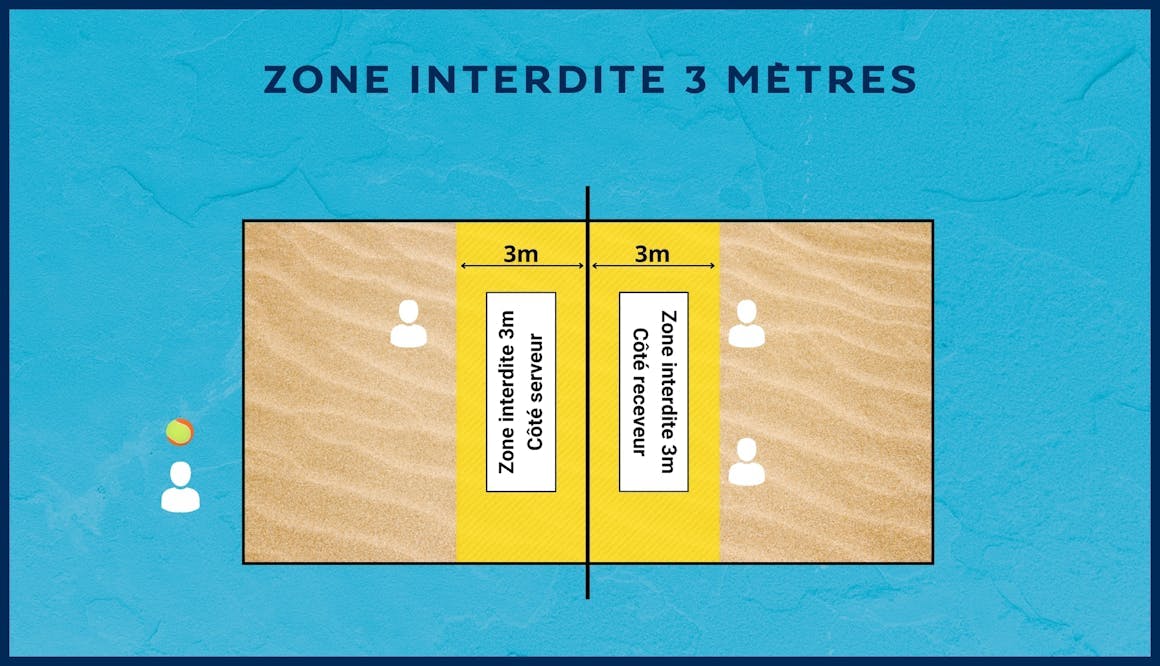 C’est la zone située entre le filet et une ligne imaginaire parallèle au filet située à 3 ou 6 mètres du filet, selon les catégories. Elle doit être clairement indiquée par un marqueur - cône souple ou ruban - placé sur ou juste en dehors de la ligne de côté. Aucun marqueur ne doit être placé dans le terrain. Aucun joueur ne doit toucher la zone interdite avant que le balle soit en jeu.